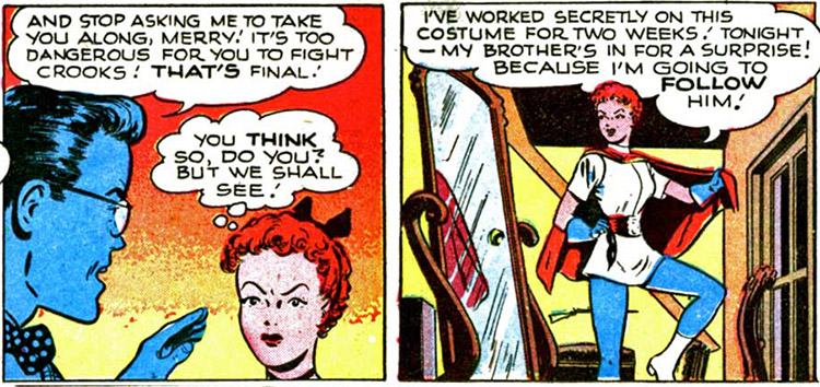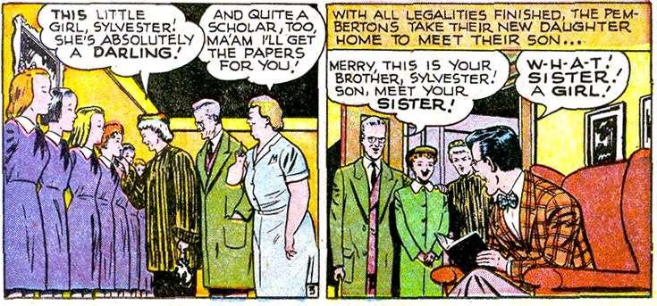 "The Star-Spangled Kid" feature was reinvented in 1948 with the introduction of an all-new adopted sister, Merry Craemer. After noticing a wound on Sylvester's forehead, Mr. Pemberton sent his son to a psychoanalyst. The professional concluded that it would be best if he had a sibling, and perhaps they could adopt one! Away to the orphanage they went and returned with the new addition to the family. Merry was ever-present, which cramped Sylvester's (and his alter ego's) style.