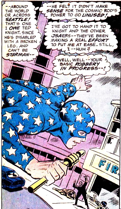Although they had been trapped for a relatively short time, decades had passed in the 20th century; Pat and Sylvester returned to an all-new world. The Star-Spangled Kid was an anomaly — born forty years ago but still in the body of a teenager. He was still driven to fight crime and took the opportunity to join the Justice Society at a time when other younger heroes like Robin and Power Girl were rejuvenating the team. He also began using Starman's cosmic rod. (All-Star Comics #58) They tinkered with the weapon, eventually fashioning it into a "cosmic converter belt." (#64)