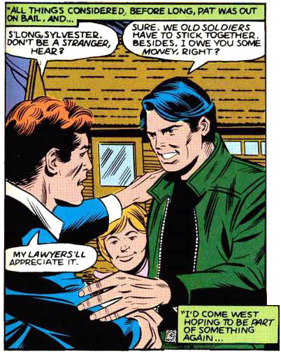 Win Mortimer took over the art chores with Star Spangled Comics #71 (Aug. 1947) and the story picked up somewhat, sometimes focusing more on the human character of its stars. When Pat's new reading lamp caught fire, it burnt the Pemberton garage down, and some autos with it. Pat was sacked. He was exonerated when they learned that the lamps had been rigged to spy on rich targets. (#71) Pat also taught boxing to other manservants and arranged bouts for charity. (#76) Sometimes his "common" demeanor rubbed the Pembertons' guests the wrong way; he was sent to finishing school. (#79)