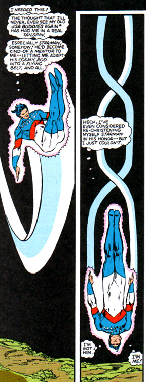 Later, the Star-Spangled Kid used Starman's cosmic rod, which he refashioned into a Cosmic Converter Belt instead. Its cosmic power allowed him to fly, construct force fields, and fire concussive force.
