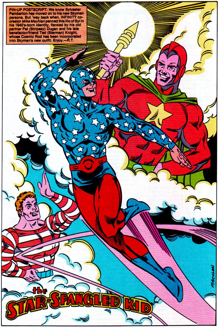 Star's belt was damaged in the fight with Ultra-Humanite, so he made a visit to Opal City to see his mentor, Ted Knight (Starman). While he was there, Sylvester responded to a local police call and captured the Icicle. He was considering a name change and wondered if it was time for him to become the next Starman. Back at the observatory, Ted even encouraged him to do that very thing, but Sylvester declined (perhaps sensing that one of his sons would carry on). On his way out, Syl met Ted's son Jack Knight, who said to him, "have fun in the sky, man," which inspired his new codename. Ted later sent Syl a new red belt and stored the original golden one. (Stars and S.T.R.I.P.E. #0) The Star-Spangled Kid later updated his costume and became Skyman. (#31) He used his fortune to produce a trailer to promote the team's services. (#40)