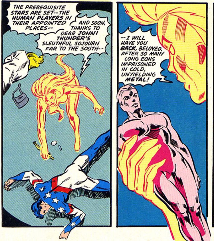 In Los Angeles, Sylvester found himself attracted to a young private detective named Jonni Thunder (no relation to the JSA's Johnny Thunder). She helped him battle Knodar in Hollywood. (#24) When Jonni Thunder was overtaken by the power of her own mystic Thunderbolt, she summoned its mate, which installed itself in Skyman's body. The two "bolts" were part of a race which had long ago stored its essences in metal figurines. They were driven back into the objects, leaving Jonni (thankfully) powerless. (#41)
