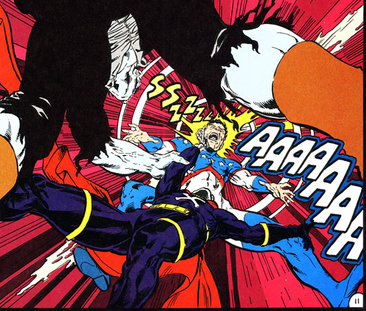 The Star-Spangled Kid was a teenage prodigy who by day kept to his books, but in secret trained with Stripesy to learn boxing, wrestling and acrobatics. Their strength seemed unrealistically high, as they would one-handedly whirl grown men above their heads. The Kid was also a master of strategy.