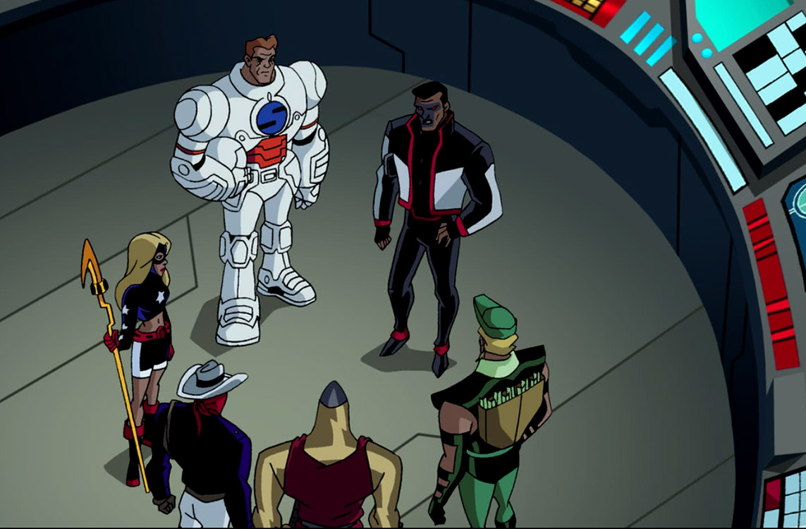 - Episode 7 ("Patriot Act," 25 Feb. 2006) featured a new grouping of heroes that mirrored the original Seven Soldiers of Victory. With the most powerful League members busy, Green Arrow leads Stargirl, S.T.R.I.P.E., Shining Knight, Crimson Avenger, Vigilante, and Speedy against General Wade Eiling, who had transformed from ingesting a super-soldier serum. The episode also features a cameo by a group of street urchins who resemble the Newsboy Legion. The introduction features a Spy Smasher tale from World War II.