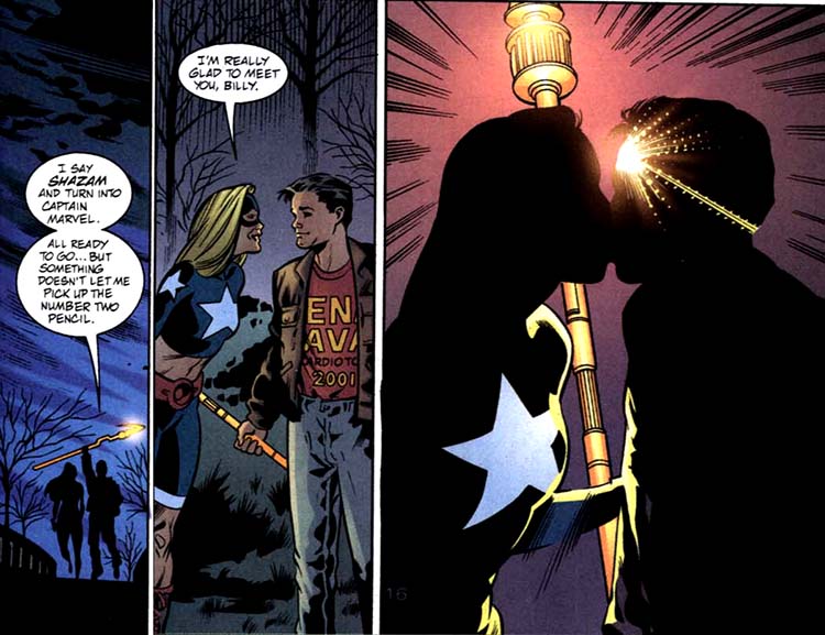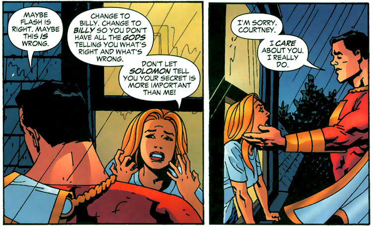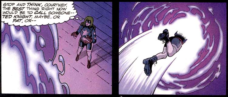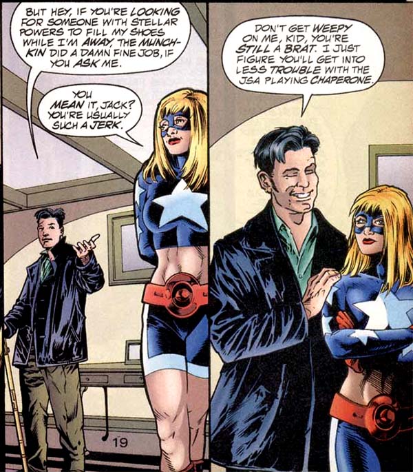 The Star-Spangled Kid had romantic near-misses with two of her Justice Society colleagues. The first was Captain Marvel, whom she allowed into her affections after she learned that he was also sixteen years old. (JSA #48) The affair was considered inappropriate by their mentor, the Flash; Jay did not know about Captain Marvel's true age, and confronted him with serious concerns. Rather than reveal his identity to another person, Marvel chose to resign from the team, which ended any relationship with Courtney. (JSA #59)
