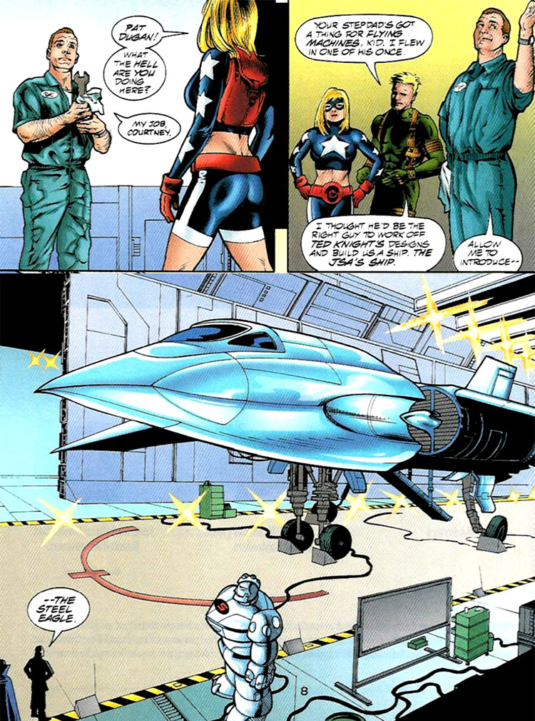 Still on edge about Courtney's safety in the hero game, Pat was glad to accept the JSA's invitation to become their team mechanic. He unveiled a new aircraft for them, the Steel Eagle. (JSA #7)