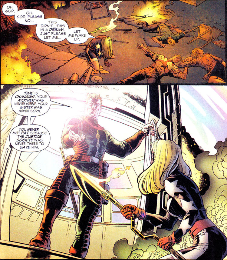 As she made this step in maturity, Courtney was served a true adult challenge. Her family (including her newborn sister, Patricia) was murdered by the Red Morgue. She was rescued by the time traveler Rip Hunter, who explained that the JSA's old foe Per Degaton was attempting to eliminate heroes from the time stream. (JSA #68) She and the JSA were able to reverse Detaton's tampering and Stargirl returned home to find her family restored, and alive. (#72)