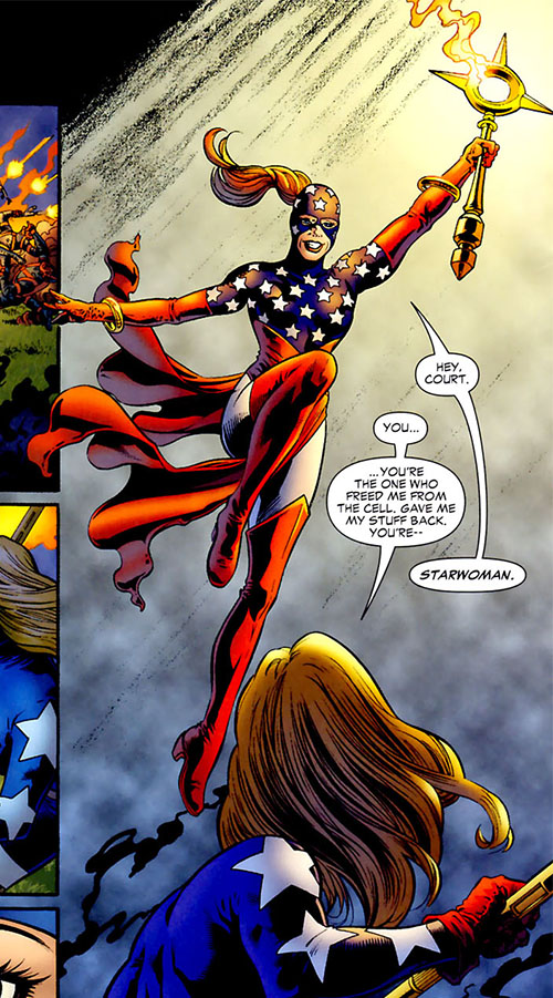 After a painful case which led her to apprehend her own biological father (a member of the Royal Flush Gang), Courtney finally stepped in the path of the Starman legacy and changed her code name to Stargirl. (JSA All-Stars vol. 1 #4) Not long afterward, she received a visit from the Shade, who delivered the news that her father had died. (JSA #81)
