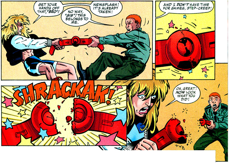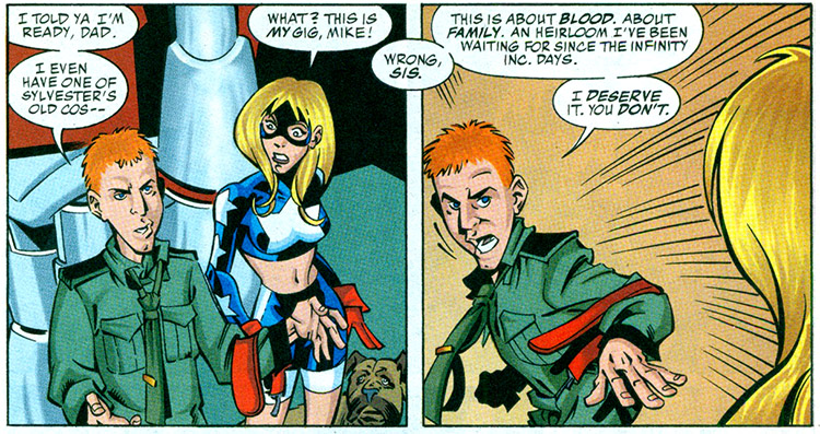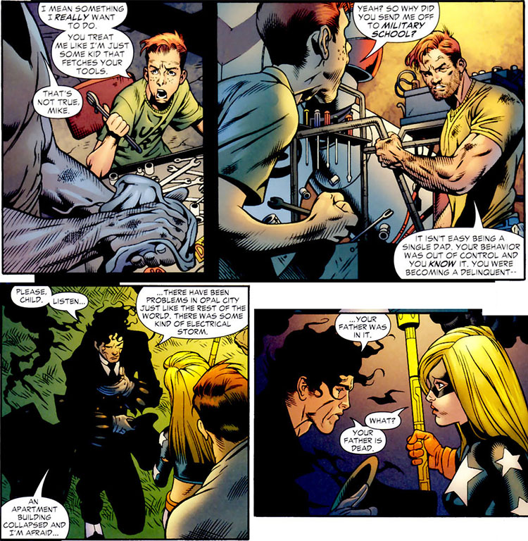 Courtney's relationship with her step-father was already shaky when Pat's son arrived to live with the family. Mike Dugan had been expelled from his military academy and the boy was eager to take up the mantle of the Star-Spangled Kid. His arrival prompted Pat to finally tell Courtney how he'd remained young despite having been active in the 1940s. (#9)