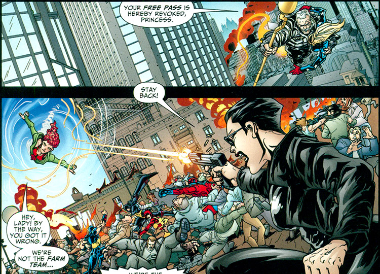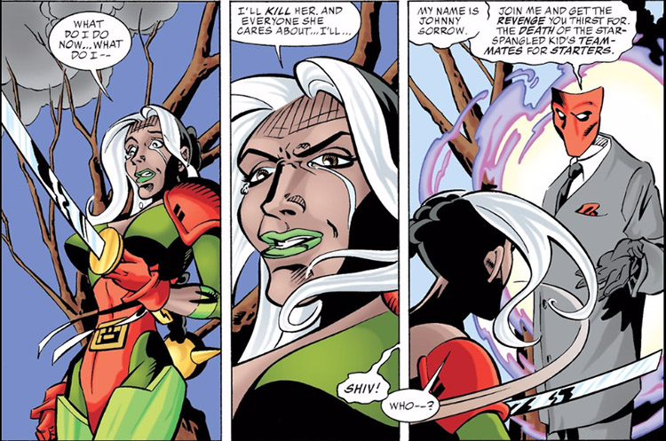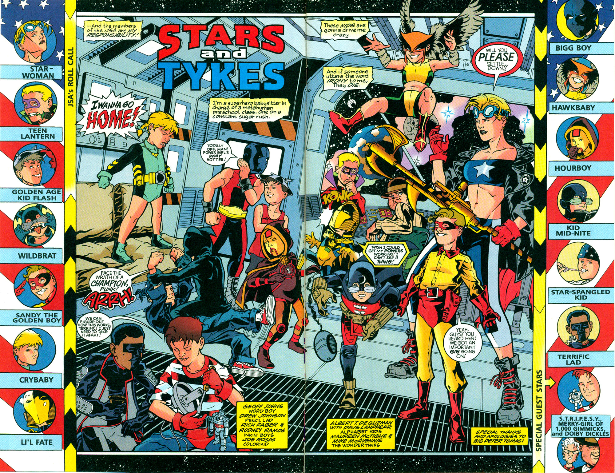 Though she was surrounded by new teammates her own age, Stargirl preferred the company of her older mentors. So it was with some difficulty that she agreed to go with Power Girl when she led a splinter team of young JSA members, the JSA All-Stars. At their first conference, Arthur Pemberton's (Sylvester's nephew) Strike Force attacked and kidnapped Stargirl for Johnny Sorrow — who claimed he was in love with her! (JSA All-Stars vol. 2 #1)