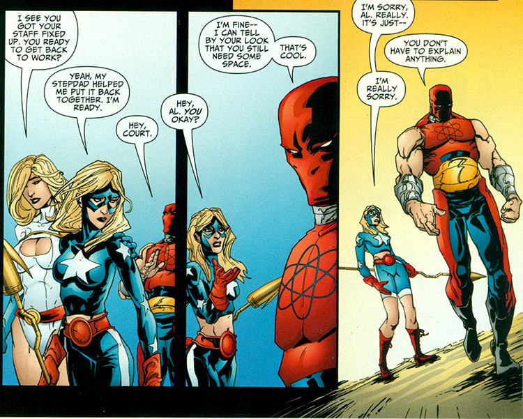 Atom-Smasher had also returned to the team and the two of them attempted to repair their friendship. He was called in to help when the villain Kung attacked, and five JSAers were transported to the moment of Hiroshima's destruction, in 1945. (#27) Kung's spirit escaped into Stargirl's body but the Spectre cleansed her. Back home, Al denied what were obvious romantic feelings between Courtney and he. Instead of moving toward her, Al denied that he had any love for Courtney. (#28)