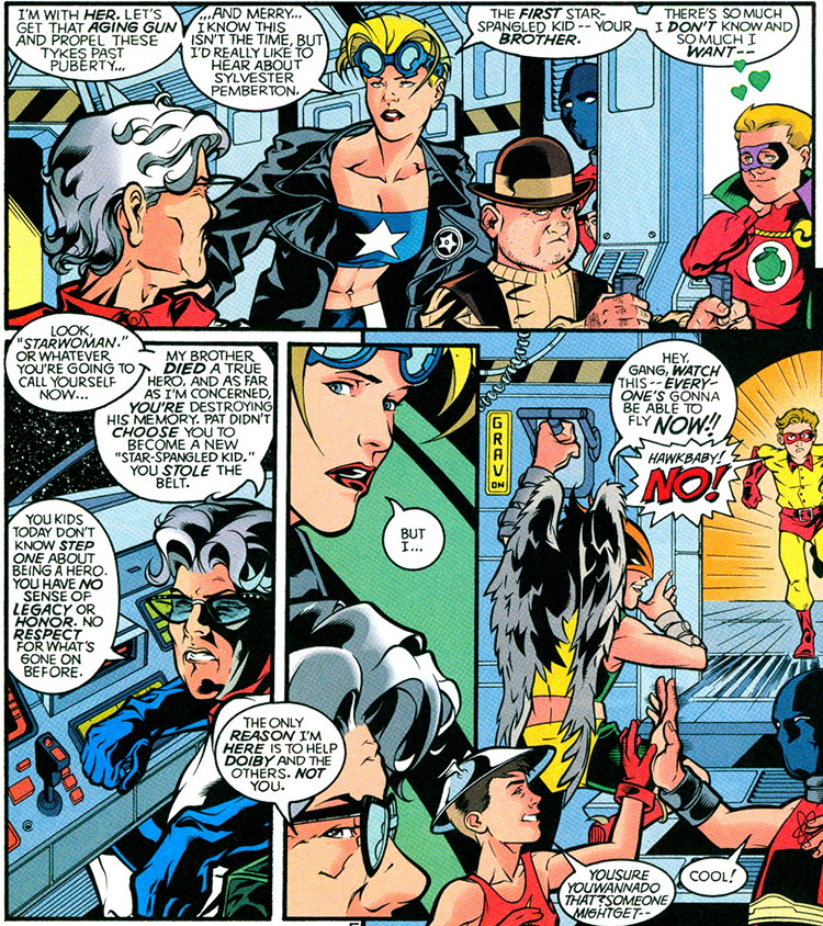 When the boy magician called Klarion cast a spell to reverse all the super-heroes' ages, Courtney found herself more of a "Starwoman," playing nanny to a juvenile Justice Society. (Young Justice: Sins of Youth #1-2) To try to reverse the spell, she joined forces with Merry, the original Kid's sister, who accused Courtney of stealing her brother's gear. They traveled into space with Doiby Dickles to the planet Myrg (in a spaceship designed by Pat), where they hoped to acquire a "de-aging gun."(Sins of Youth: Starwoman and the Junior JSA #1)