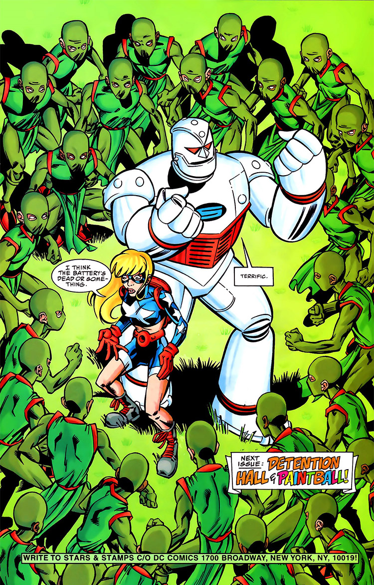 Afterwards, Pat consulted with Ted Knight (the original Starman, who invented the cosmic converter), who said that the belt would likely work differently for Courtney, and that it might take time for it to calibrate itself to her. At school, Courtney and Mary earned detention under the orders of Mr. Paul Deisinger, who ate crayons and turned out to be a super-villain called Paintball. (#2) Elsewhere, Dr. Graft created monsters within a secret laboratory, and bestowed Cindy Burman — who was the Dragon King's daughter — with special enhancements. (#3)