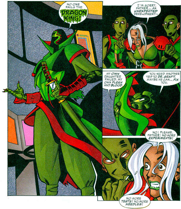 When Courtney and Pat returned to Blue Valley, the Dragon King emerged fully, with a plan to take over the world. Shiv returned with new implants and extensible fingers. Courtney was kidnapped by Dr. Graft (a protegé of Dr. Weerd, an enemy of the original Kid's), prompting the Shining Knight came out of the shadows to rescue her. (Stars and S.T.R.I.P.E. #10)