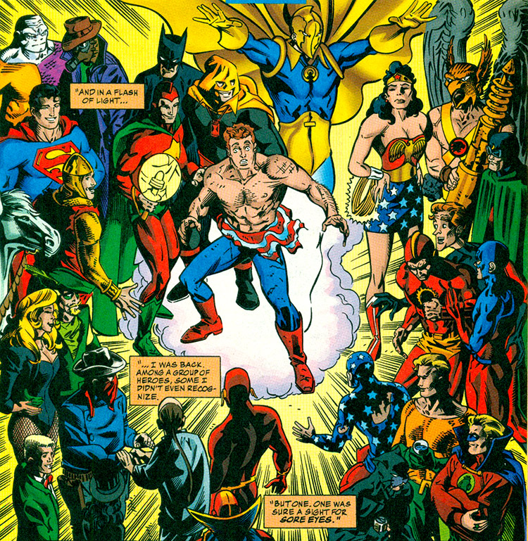 The Seven Soldiers' greatest enemy, the Nebula Man, returned when his energies collected sufficient strength to take over the corpse of his destroyer, Wing. Nebula Man emerged from a grave in Tibet and zeroed in on the cosmic energy in Courtney's belt. In Nebraska, Dr. Robert Crane (the original Robotman) was helping Pat to improve his armor. Crane's robot dog, Robbie, dug up a prototype of the Nebula Rod, the weapon used to defeat the Nebula Man in their first battle. When Pat learned that the Nebula Man had returned, he called upon all major super-heroes for support, but amazingly, Courtney dispersed the villain's form by using her belt, plus electrical energy. (#8) Note: This issue retrofitted the Seven Soldiers' history for post-Zero Hour continuity.