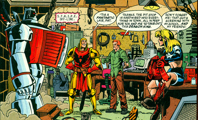 After her first day, Courtney returned home and rummaged through one of Pat's boxes. She discovered a news clipping of him and Sylvester — as the Star-Spangled Kid and Stripesy! Courtney took the Kid's old Cosmic Converter belt, made a star-spangled costume, then attended a school dance later that night. Pat was a chaperone, and was furious to see what she'd stolen. Thankfully she had, though, as the dance was attacked by green-clad minions of the Dragon King. Courtney blindly jumped into action using the power of the belt, and Pat unveiled a new exosuit, called S.T.R.I.P.E. (Stars and S.T.R.I.P.E. #1) NOtE: The Dragon King first appeared in All-Star Squadron #4 (Dec. 1981).