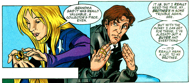 She agreed to go with Sorrow into the "Subtle Realms" to prevent the team's certain defeat. There she found who she thought was Atom-Smasher (actually Sorrow in disguise). (#4) During her time there she fought at his side and expressed her love for "Al," even kissing him for the first time. (#5) This true-love kiss allowed Sorrow to magically revert to human, and Stargirl's "purity" enabled her to kill their enemy, the monstrous King of Tears, with Sorrow's dagger. (#6)