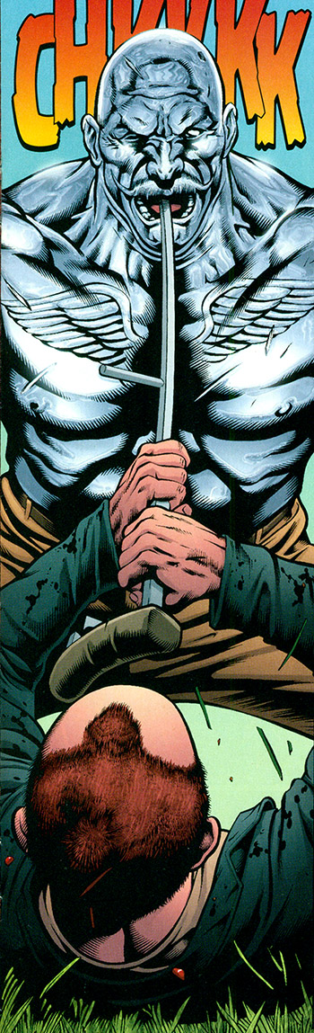 While fighting, Nathan stabbed Reichsmark through the mouth. Metallic blood ran over Nathan's body and was absorbed by his skin. His body went into shock and he was taken to JSA headquarters where he was put under the care of Dr. Mid-Nite. (#3) While comatose, his entire body transmuted into organic steel and grew a new metal leg. (#4)