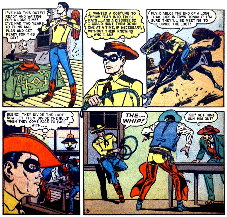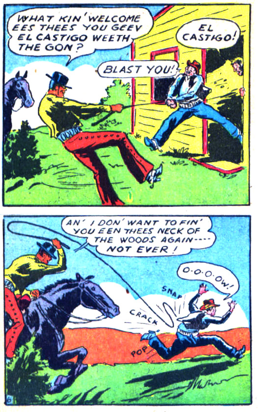 The legend of the Whip began in Mexico. was Don Fernando Suarez, descended from Grandees of Spain, protector of the poor in Mexico (el Castigo) in a mask and bolero. Marissa Dillon was also a champion of the poor. Elsewhere Rodney Elwood Gaynor is a polo ace at his Long Island club. Later he and his 'man' Wing set out on a trip to Mexico, town of Seguro where he runs into no goods. He learns of the legend of El Castigo from Marissa and a local padre. There is a fight over the fate of a man Carlos condemned and El Castigo charges in on a black horse to break it up and challenge the crooked local sheriff. Gaynor adopts a local accent and frees the man. Later she wonders if he's visited South American where one would lean to weild a long bull whip. (Flash Comics #1)