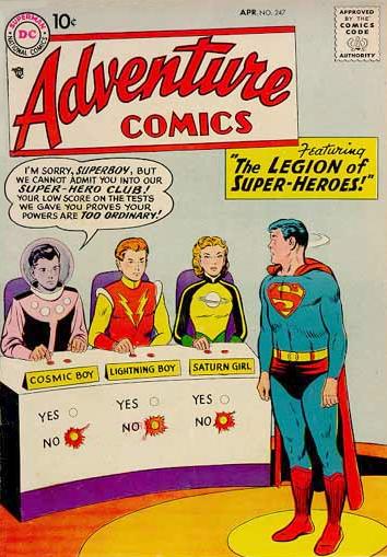Introduced in Adventure Comics #247 (Apr. 1958), this organization of super-powered teenagers from the future was inspired by the legendary exploits of Superboy. They traveled back in time to meet him, admitting him to their ranks after a rather cruel initiation (after the Legionnaires pretend to reject him, Superboy thinks sadly, “How will I ever tell them back in Smallville that their ‘superhero’ flunked out of the super-hero club? (Sob!)"). It was just a one-shot story, and not a particularly unique or memorable memorable one; the Legion did not appear again until almost two years later (Adventure Comics #267).
