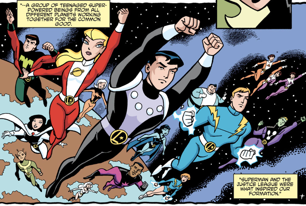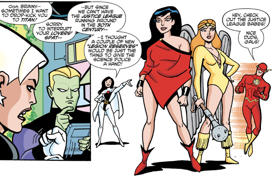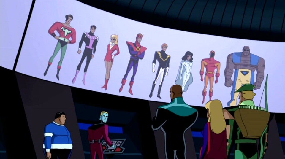 Brainiac 5 and Bouncing Boy introduce the Justice League members to the Legion. From "Far From Home," Justice League Unlimited season 3, episode 10 (2006).