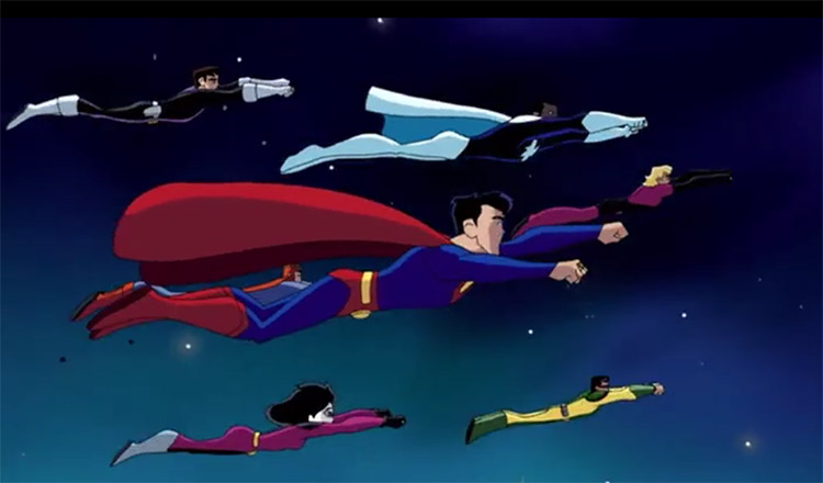 The introduction sequence shows some Legionnaires who do not regularly appear in the show — Cosmic Boy, Star Boy, Element Lad, Colossal Boy, Shrinking Violet and Matter-Eater Lad.