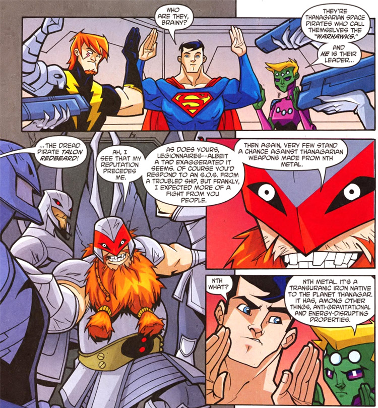 In the first issue that takes place after events of the cartoon, the Legion meets the Warhawks, which were introduced in the Justice League animated series. From Legion of Super-Heroes in the 31st Century #17 (Oct. 2008). By J. Torres and Sanford Greene.