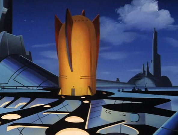Left: Legion headquarters. Right: Cosmic Boy, Saturn Girl and Chameleon Boy star in "New Kid in Town." From Superman: The Animated Series, season 3, episode 3 (1998).