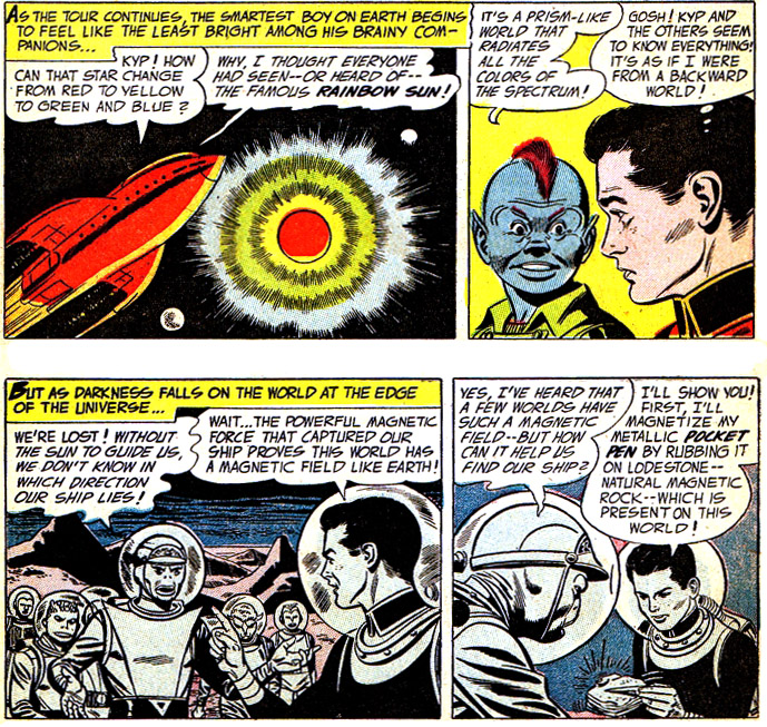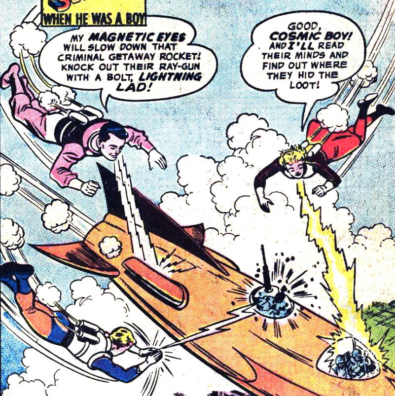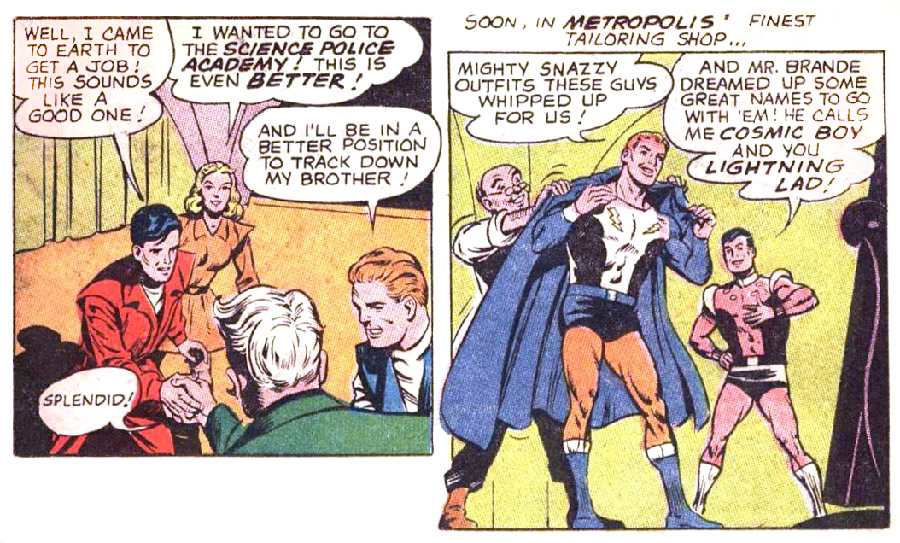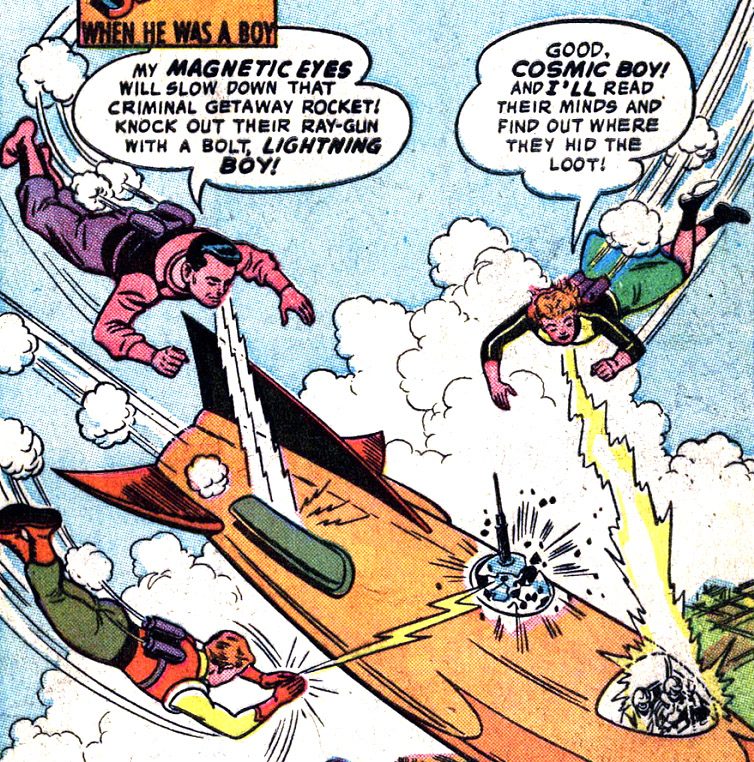 Cosmic Boy says, "Special serums gave me magnetic eyes." This is ignored in later stories. His home planet Braal, where all people have magnetic abilities, was first named in Adventure Comics #300 (Sept. 1962).