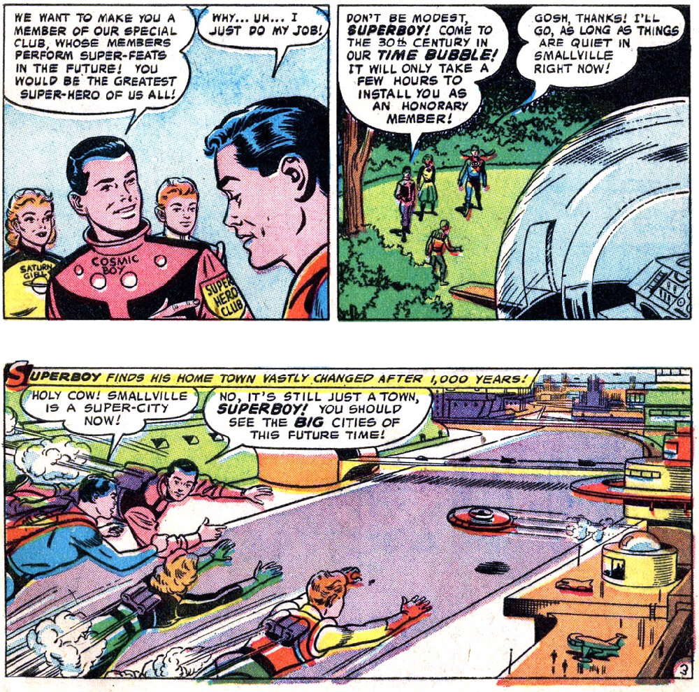 The original story shows the Legion clubhouse in Smallville, which has become a super-city! Clark Kent's "ancient" childhood home has even been preserved (or probably restored).
