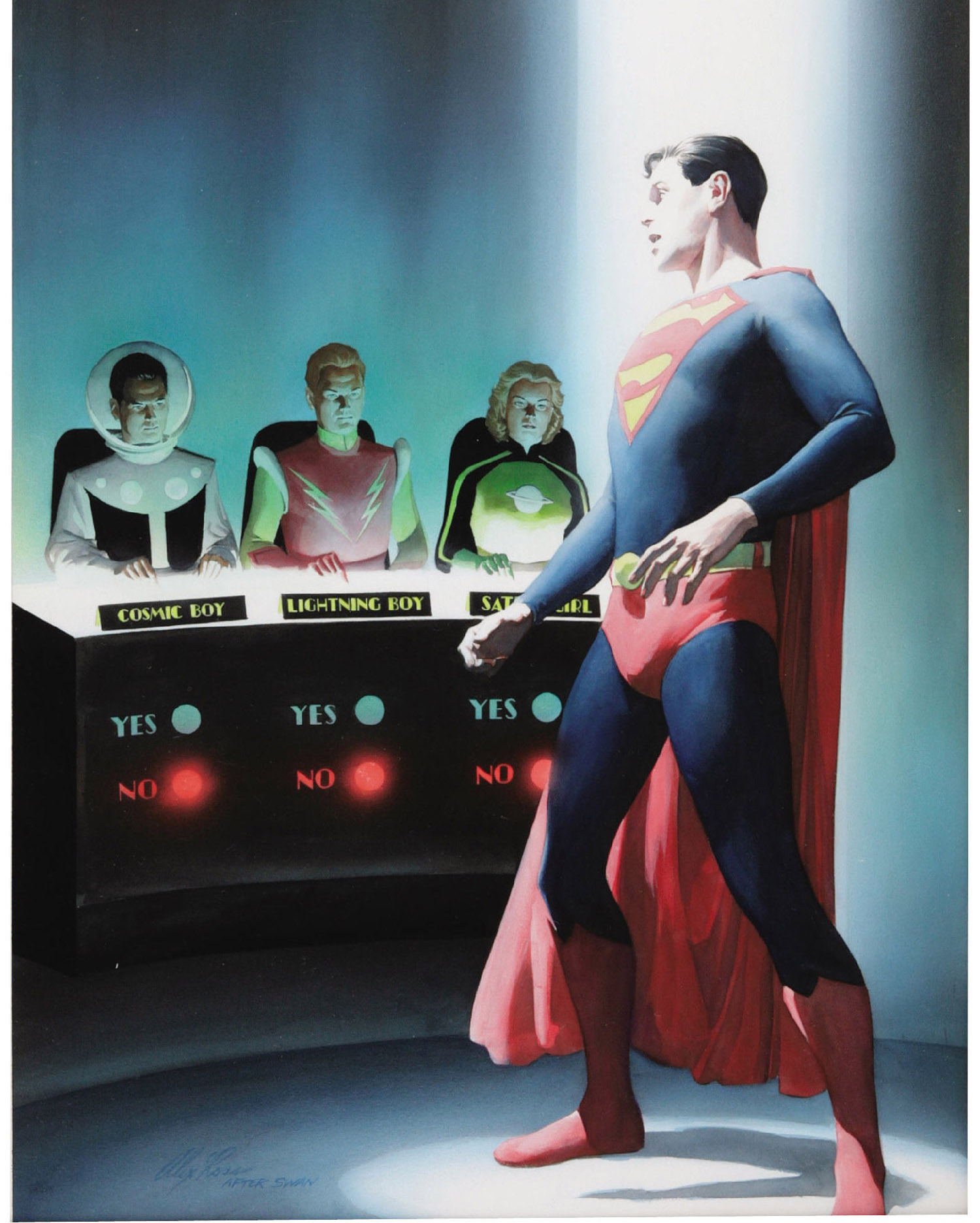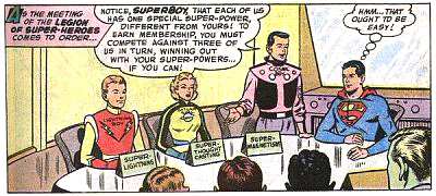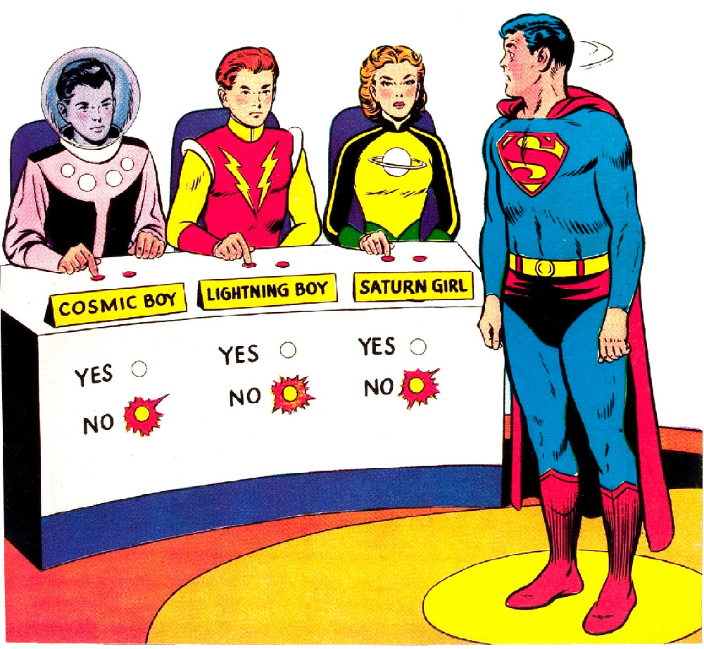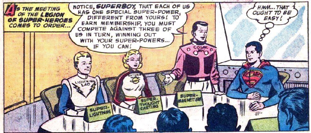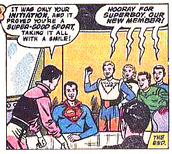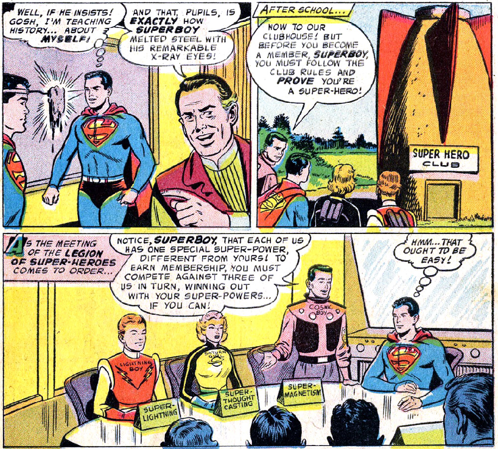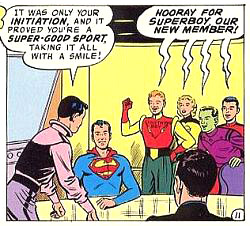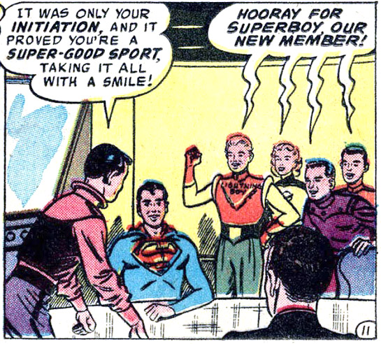 Mike Grost wrote about Superboy’s early stories in depth and identified underlying themes in classic Superman comics. Initiations — the backbone of the Legion's first story — were common in “Superboy” adventures. Superboy and the other Legionnaires perform a series of impressive super-feats, but emotion drives the story. Superboy struggles less with the physical challenges than with his longing for companionship. He displays a fear of rejection because he wants friends with whom he can be his true self. (Making super-friends had eluded Superboy for years, despite meeting many other super-powered teens.)