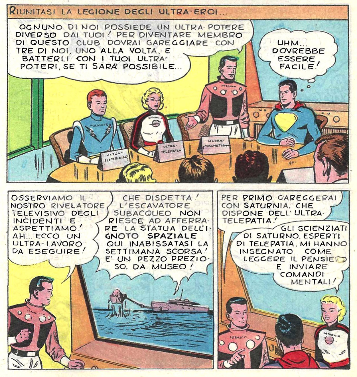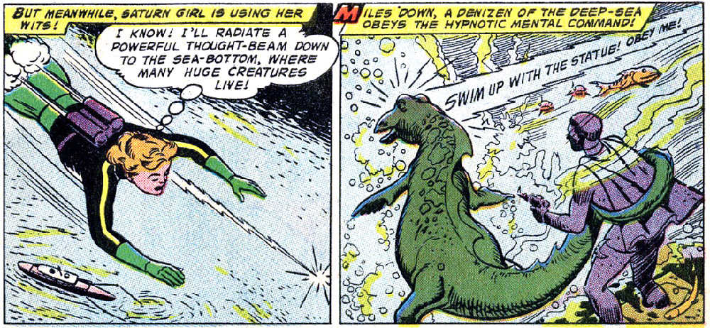 Saturn Girl uses her telepathy — taught by the "scientists of Saturn" — to command animals as well as people. In this first story she commanded a deep sea creature; coincidentally, Adventure Comics at this time was also running the adventures of Aquaman.
