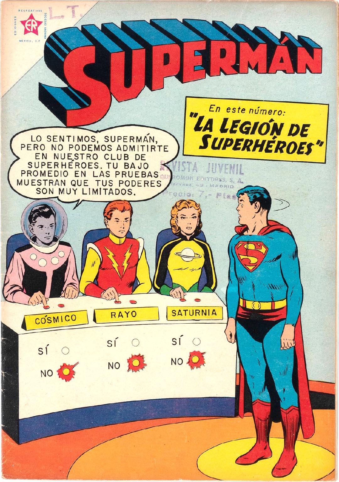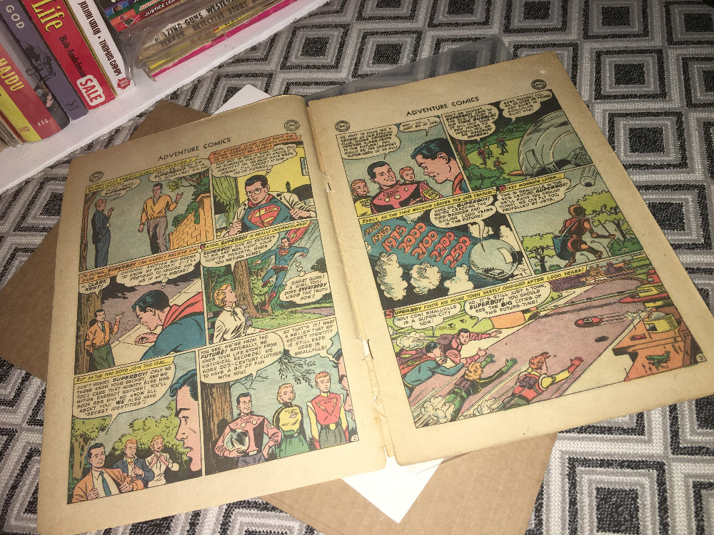I'm no thousandaire... it's coverless, and missing four pages from the center (the Green Arrow story). But in my hands, I felt the magic of holding a piece of history. It triggers my primal wonder, the spark of my love for super-hero comics. I love to take in the qualities of the old paper, the colors, the iconic heroes (Cosmic Boy, Lightning Lad and Saturn Girl) — teen heroes grouped together, OMG.