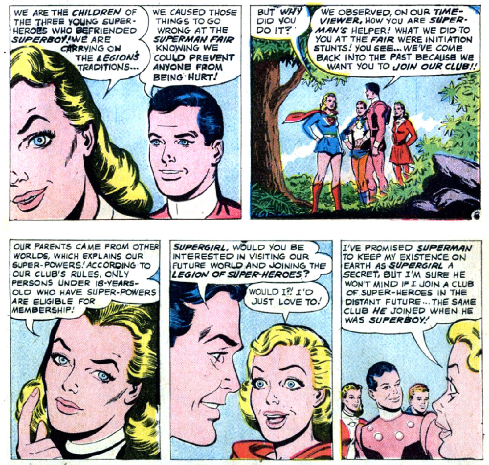 In Adventure Comics #247 (Apr. 1958), it was made clear that the group had already been operating for some time. In the Legion Clubhouse, Superboy met a group of Legionnaires — more than the original three. In two panels, these other members stood on the sidelines and cheered for Superboy.