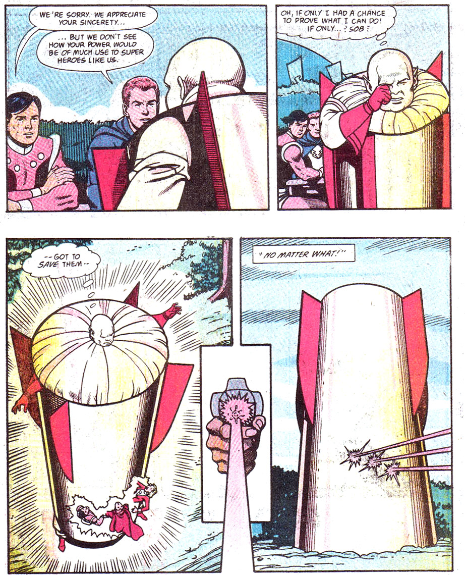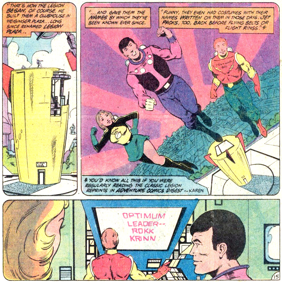 Three other stories playfully acknowledged the costumes from Legion's first appearance. A story spotlighting Cosmic Boy's origins showed the three Legionnaires in their original costumes but did not reference them in the text. (By Paul Levitz and Keith Giffen; Legion of Super-Heroes vol. 2 #297, Mar. 1983.)