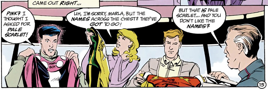 Legion of Super-Heroes vol. 4 #8 (June 1990; a post-Crisis story by Keith Giffen, Tom Bierbaum, Mary Bierbaum and Chris Sprouse), was the first to explicitly address these costumes. In that version of the Legion's origin, the team's benefactor, R.J. Brande, presented them with the oddball uniforms. They objected to Brande's lack of style but reluctantly wore them for a brief time, before asserting their preferences.
