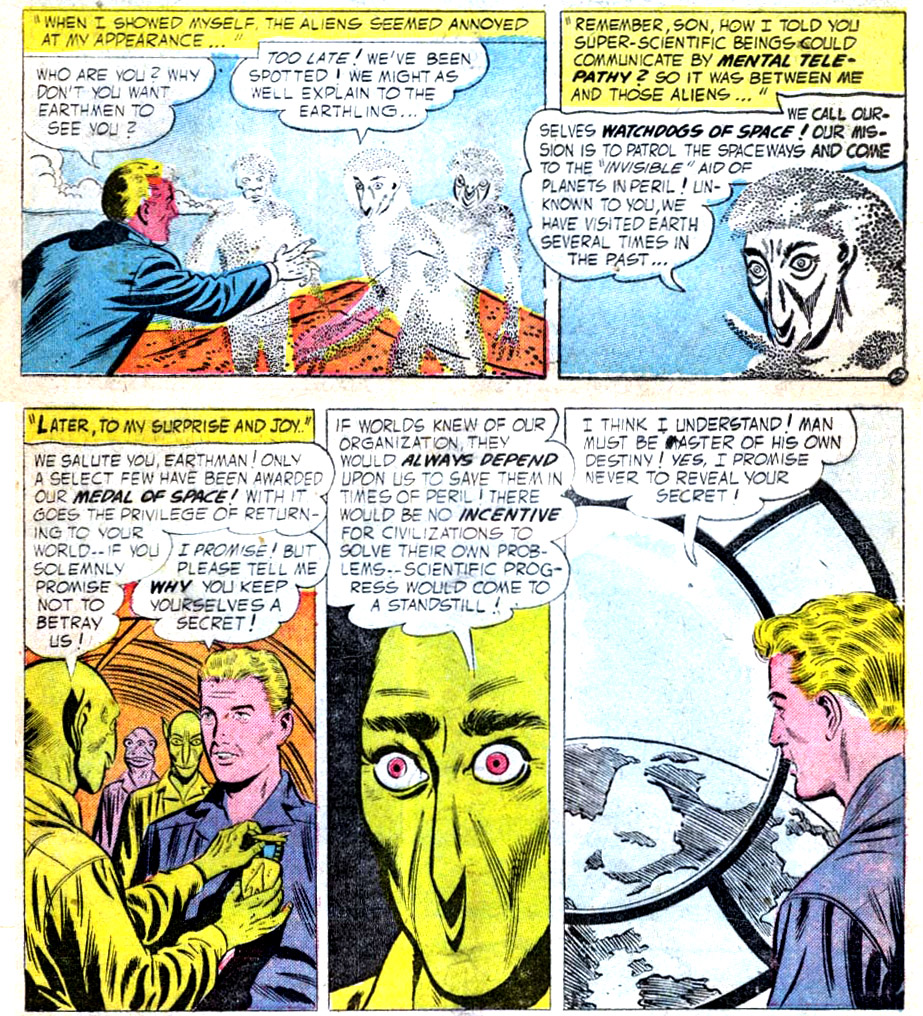 - Two issues later, Binder penned an adventure about "The Watchdogs of the Universe." Young Danny Bolton listened to his father's tale about the discovery of aliens on Earth! They were altruistic visitors, who had saved the Earth and other worlds many times over millennia: "Our mission is to patrol the spaceways and come to the 'invisible' aid of the planets in peril!” The Watchdog's members included brave men of many worlds, but they operated in secret so they would not stunt the scientific development of any world. They were forced to kidnap Mr. Bolton so he would not reveal their existence. As their dispatcher, Bolton watched them use magnetic power, and even rekindle a dead sun. For helping them so selflessly, the aliens agreed to let him return home. (Strange Adventures #62, Nov. 1955) Note: The basis of this story was recycled for the "Space Museum” feature in Strange Adventures, which began with #104.