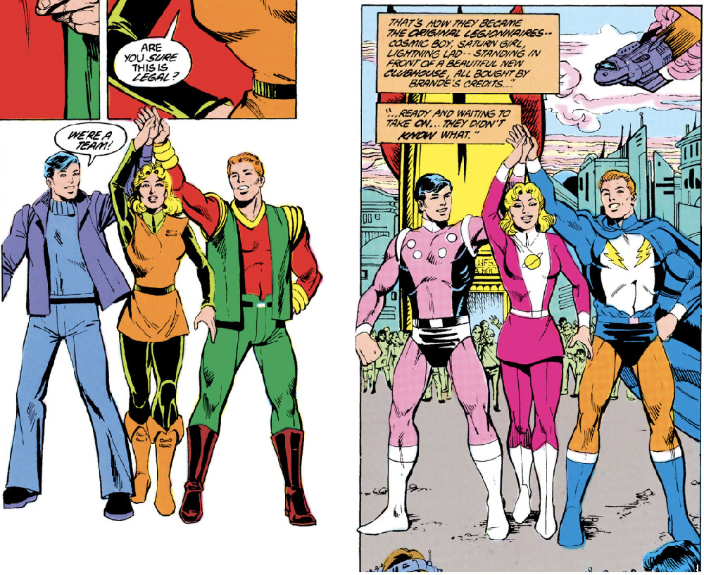 Adventure Comics #247 does not tell the Legion's origin story, so the creators who tackled that tale (the first of which came ten years later) had to decide whether to acknowledge the costumes from the Legion's first appearance. The first two origin stories were both written by E. Nelson Bridwell. Bridwell was a continuity buff, so it's surprising that he chose to sweep the original costumes under the rug (see figures).
