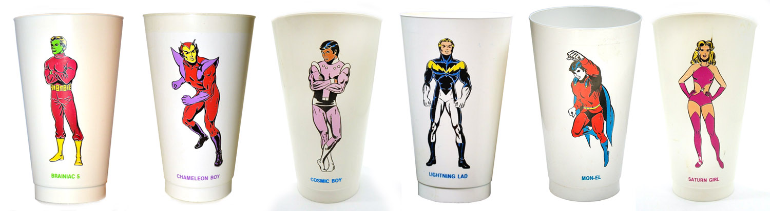 Sixty DC characters were featured on 7-11 stores' collectible Slurpee cups in the early 1970s. Cups like these can easily have become worn from washing. The back sides feature text that names the Legionnaires' real names and a brief bio. The Legion subset included: