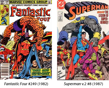 Creator John Byrne played a little joke in this story by including the four Legionnaires who most closely resembled the Fantastic Four: Brainiac 5 (Mister Fantastic), Invisible Kid (Invisible Woman), Sun Boy (Human Torch) and Blok (Thing). The cover even mimics Fantastic Four #249 (1982).