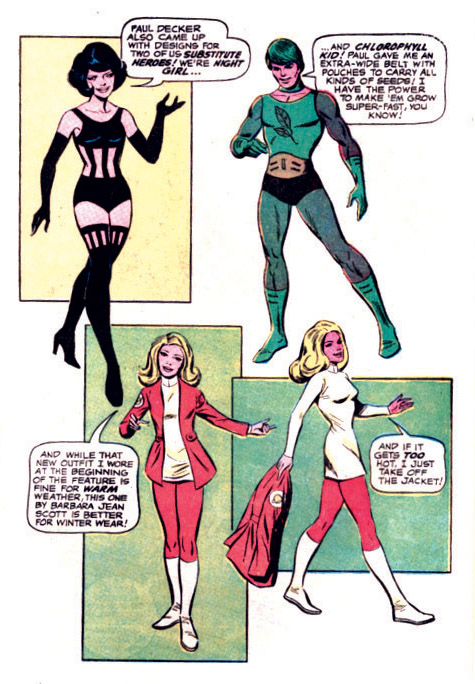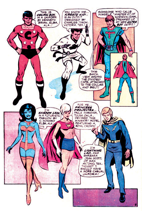 These fan-designed costumes appeared in Adventure Comics #403 (Mar./Apr. 1971), after the Legion's run ended in that comic). Only those for Duo Damsel and Saturn Girl were used permanently. For one issue only, Karate Kid, Projectra, and Shadow Lass wore these costumes, in Superboy vol. 1 #183 (1972).