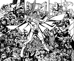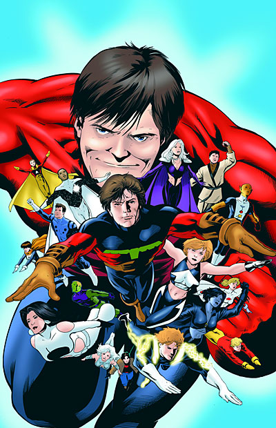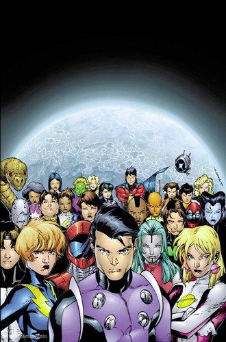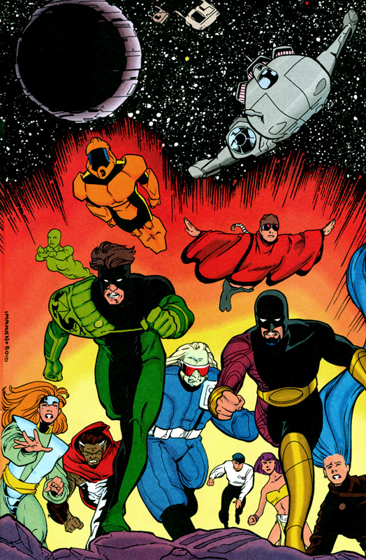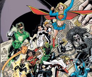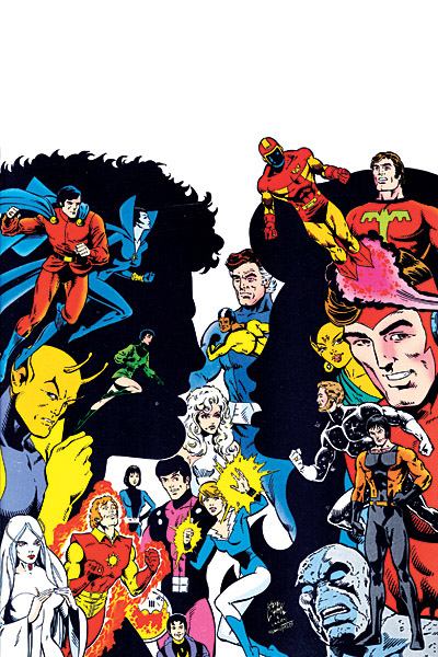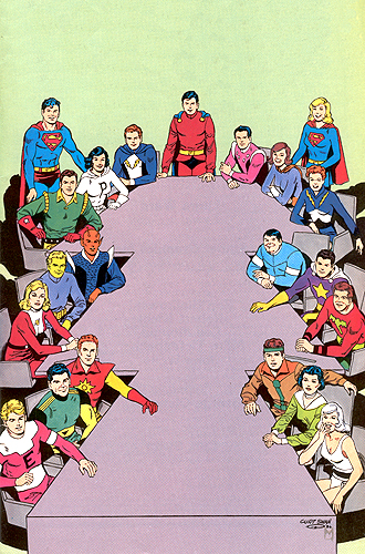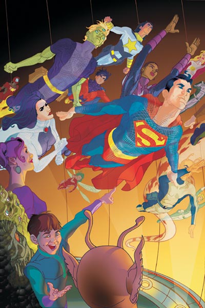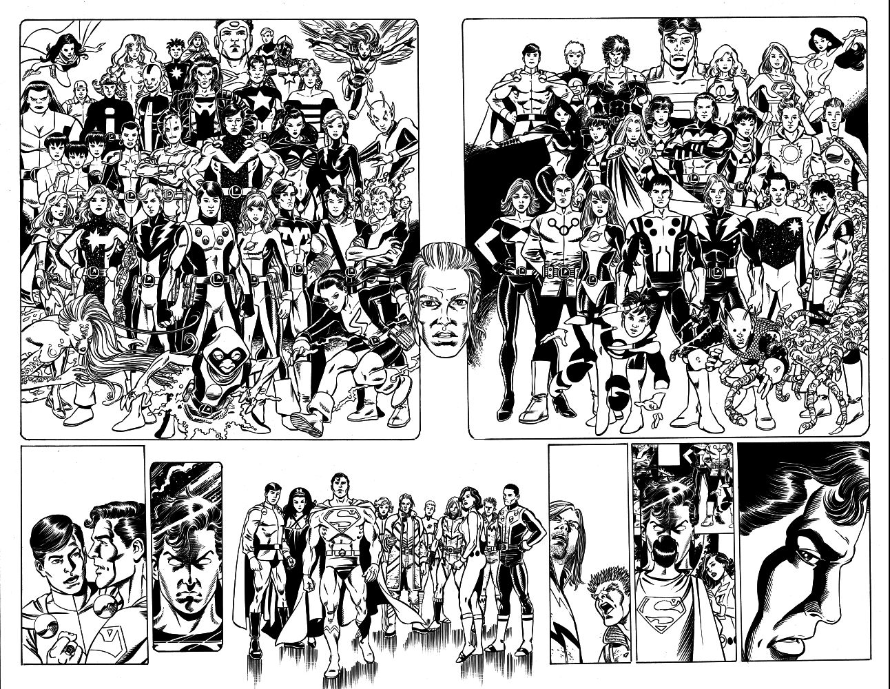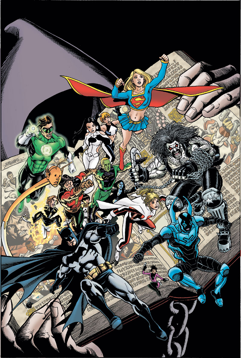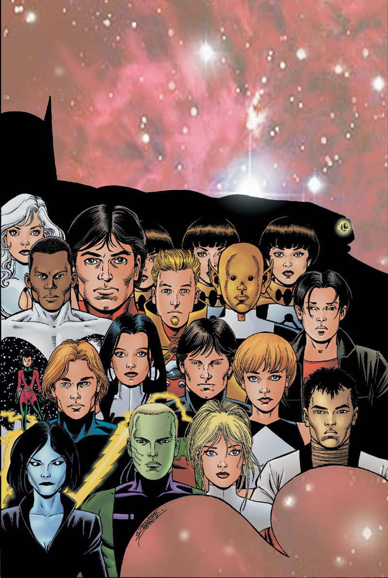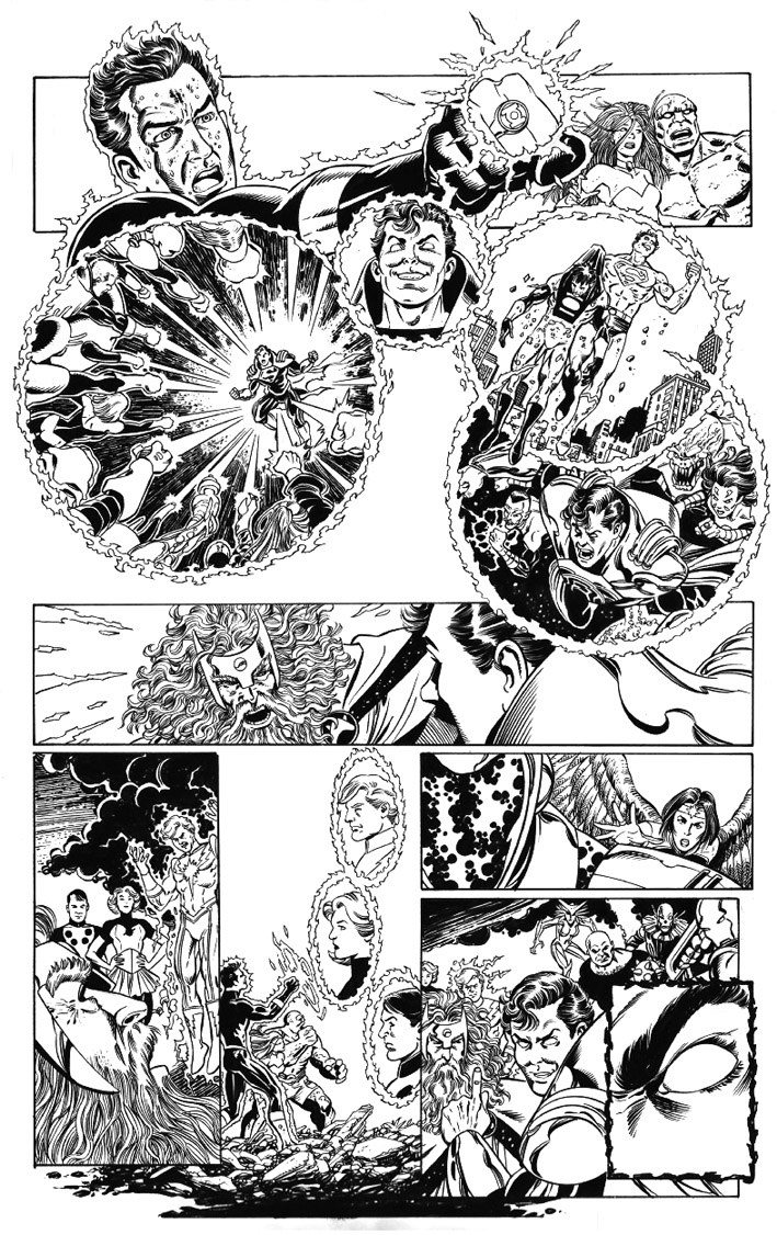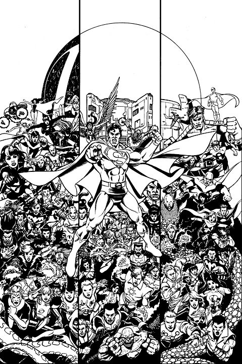 George Pérez drew this cover for Legion of Three Worlds before he found out that Final Crisis series were all supposed to have single character-themed covers. He redrew the outer panels with DC heroes and villains and the revamped cover was used as the cover for DC Universe #0. |