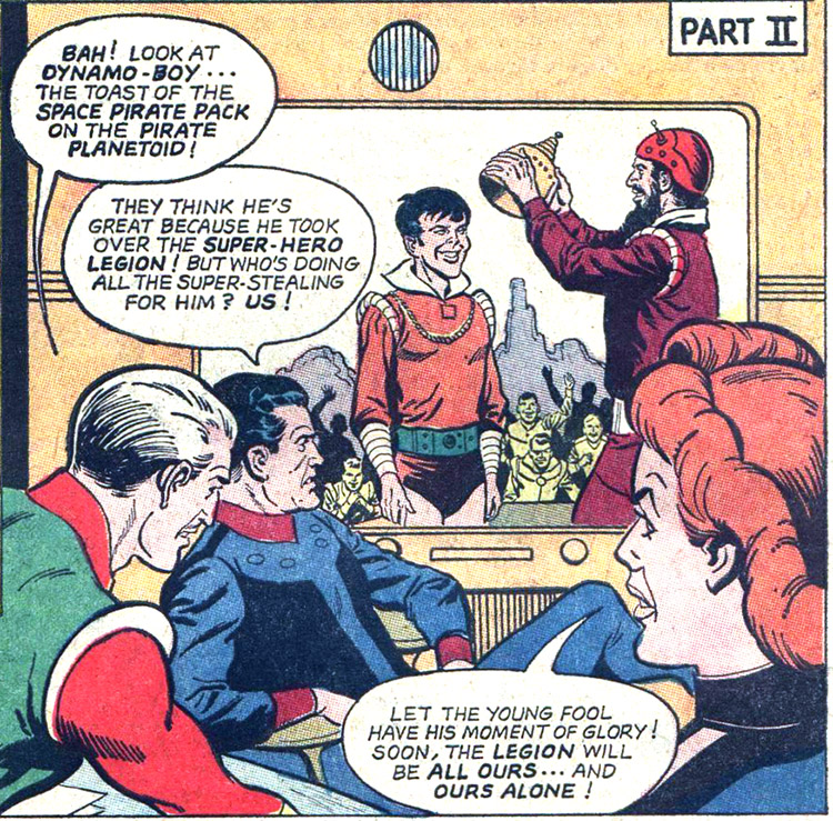 Lightning Lord, Cosmic King and Saturn Queen came from "a few years in the Legion's future" pretending to have reformed. They hoped to take advantage of the fact that Vorm, the Dynamo-Boy — a boy space-pirate — had conned his way into the Legion. Dynamo Boy had engineered the expulsion of all other members and named himself leader. (Adventure #330) To fill out the ranks of his new Legion, he was screening potential new members when the Super-Villains arrived. Their partnership with Dynamo-Boy was fruitful — too fruitful. They grew jealous of Vorm's success and accolades among his pirate-people, and plotted to betray him. They tricked him into a space ship and stranded him a trillion years into the future. But with Vorm gone, the Legionnaires returned in full-force and sent the Villains packing back to their own era. (Adventure #331) This was the canonical Legion's only meeting with Super-Villains from the future.