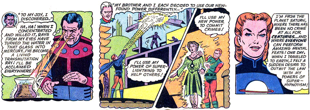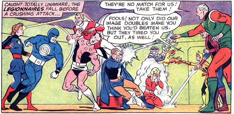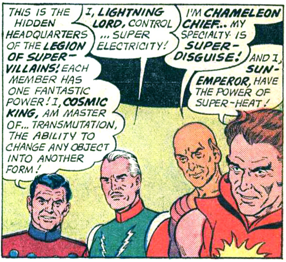 They were defeated with the timely intervention of the adult Legion of Super-Heroes: Cosmic Man, Lightning Man and Saturn Woman. Note: The Super-Villains' first appearance in print, Superman #147 (Aug. 1961), was also the Adult Legion's first appearance.