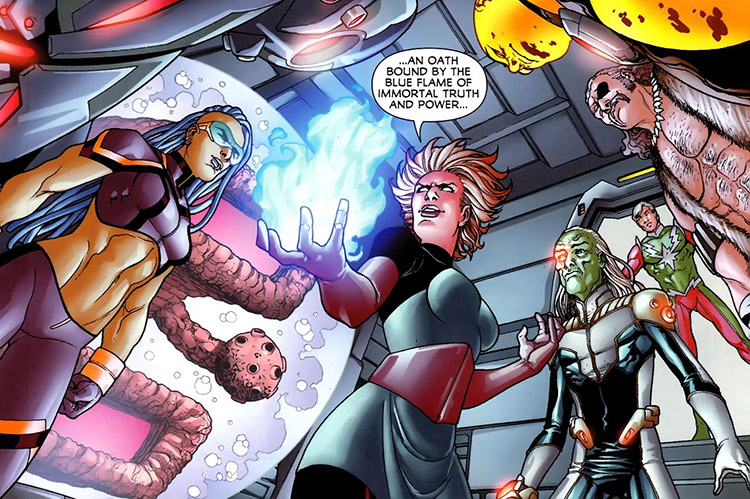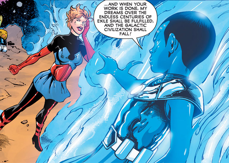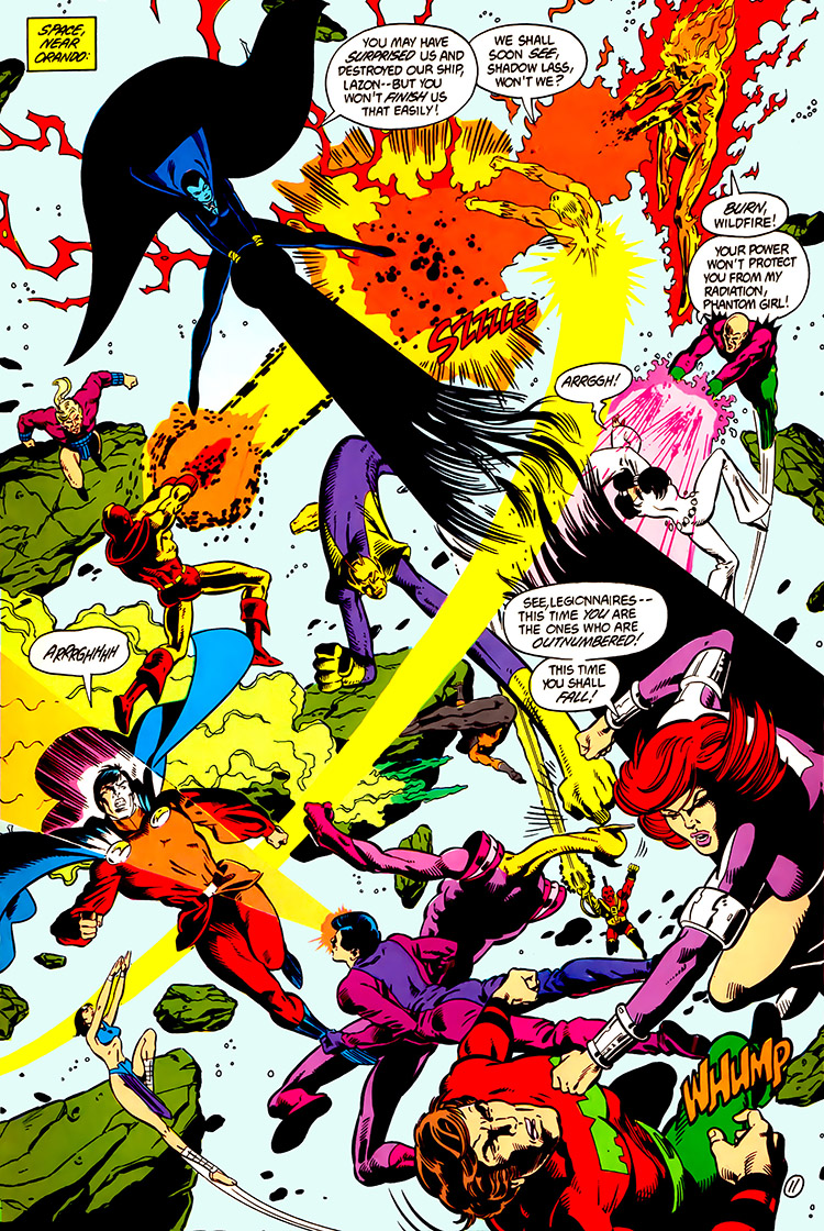 Dream Girl foresaw this epic clash — and the death of a Legionnaire. (#1) But before she could really warn her fellow Legionnaires, the LSV struck hard and fast. They chose the planet Orando for their staging grounds and captured its resident Legionnaires, Queen Projectra and Karate Kid. From there, they began stealing key items from around the galaxy. Earth's polymer shield was erected around Orando instead, and various power sources helped them to move the planet into another dimension. (#2-3)