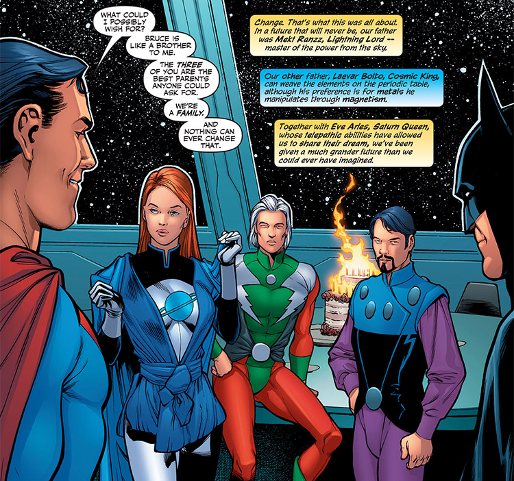 Whatever the motivation, the Villains' final plan was specifically designed to ensure the survival of their own timeline. To this end, the adult Legion of Super-Villains made one last trip to the distant past. Somehow they had concluded that in order for their own timeline to survive, they would need to dramatically alter past events. This time Lightning Lord and Cosmic King brought Saturn Queen back into the fold and traveled to the 20th century — to murder the parents of Batman and Superman and raise the heroes as their own. (Superman/Batman #14)