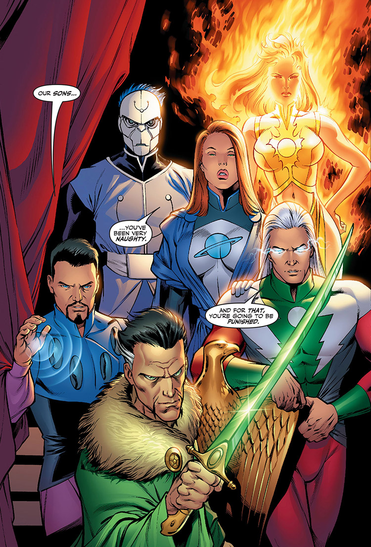 The LSV raised Superman and Batman as their children. They also sabotaged and murdered those who were destined to become Earth’s other major heroes — Hal Jordan, Aquaman, Barry Allen, Martian Manhunter. While the parents remained mostly in their moon-based home, their mighty sons subjugated the Earth completely. Their reign was eventually challenged by Princess Diana and a band of Freedom Fighters. Diana slayed Batman, and was slain in turn by Superman. Batman's death set the LSV's carefully executed time-tinkering into a spin. (#15)