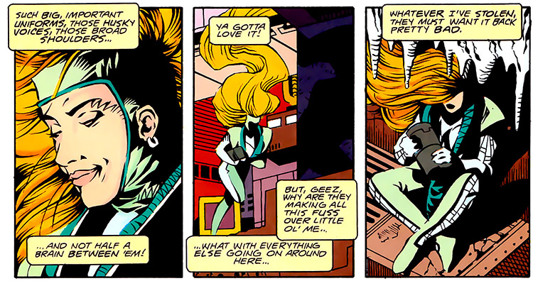 Saturn Queen continued on her quest to restore the Hypno-Stone of Ouranos to her family on Titan. She learned that the stone had been stolen by the thief Magpie for Prince Evillo of Tartarus. But because of a disagreement, Magpie hid the stone from Evillo. (Legion vol. 4 #49) Eve traveled to Tartarus and became Prince Evillo's twelfth wife. As Queen, she had the resources needed to track down the Stone. While there, she also met the former Legionnaire, Tenzil Kem (Matter-Eater Lad). Tenzil was imprisoned by Evillo but escaped and ultimately destroyed his realm of darkness. (#14)