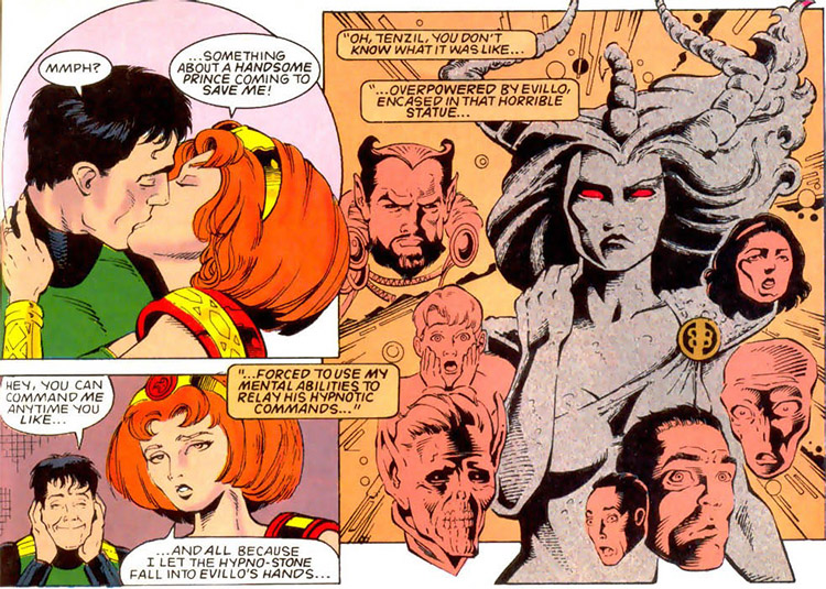 After this, Evillo's power was greatly curtailed and Eve finally found the Magpie's hiding place for the Hypno-Stone. But Evillo was watching. He snatched it from her hands and used it to enslave his world once again. Eve reached out mentally for Tenzil's aid again, and he helped her to overthrow Evillo for good. (Legion vol. 4 #49) Back on Titan, Eve's family was on the brink of losing the throne. For her to resume her position, she would have to marry immediately. For better or worse, she chose Tenzil as her husband. (#50)