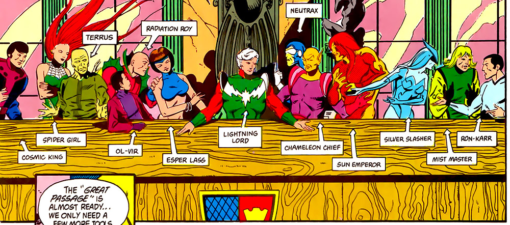 The Legion caught up to them on Rimbor, (#12) but the Adversary's power helped them persevere. (#13) He enabled the Hunter to find their next target, the secret world of wisdom, Utopia. It was protected by a mystical barrier and guarded by Master Kong (the ancient Confucius). (#14) There the Adversary grew to his fullest, and the Super-Villains tested the entire Legion's might by summoning more troops from Takron-Galtos. (#15)